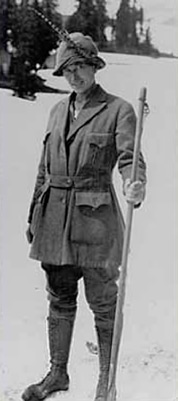 Alma had come to the Northwest wearing a jaunty Tyrolean hat decorated with a pheasant feather. Her hat and feather became her trademark as a guide. The rest of her outdoor clothing was warm and practical for use in uncertain weather conditions. The weather did not dampen her enthusiasm for climbing, however. In an interview appearing in the April 18,1923, Tacoma News Tribune, Alma declared, “I wanted to get up among the clouds and to feel myself as free as the birds and the air, and to be able to shout my freedom as loudly as I liked without having someone point to me sadly and say ‘It is not pretty for little girls to climb windmills.'”